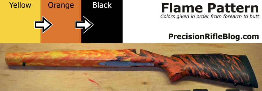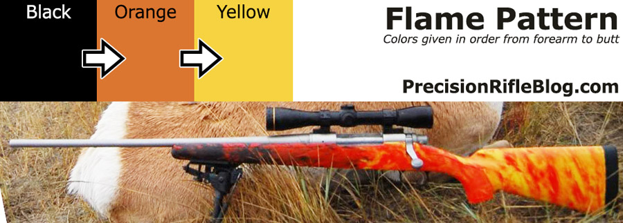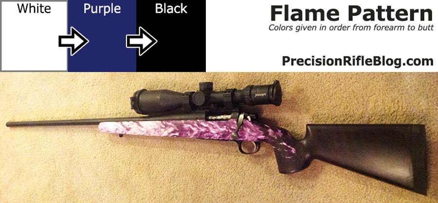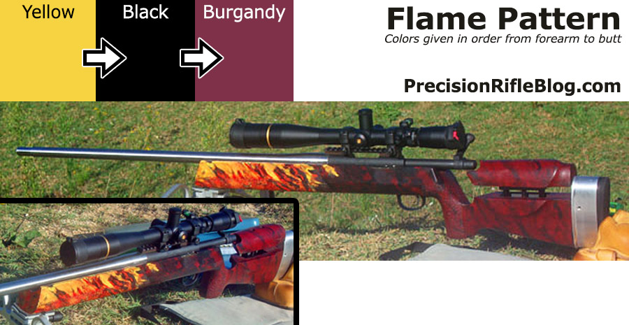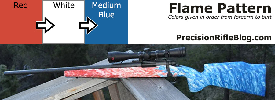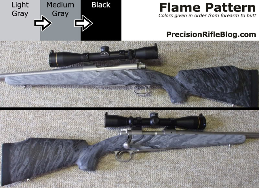 This photo gallery contains McMillan marble stock pictures that have the “flame” finish. McMillan’s flame marble stock finish (also somtimes called a fade finish) is made using three colors that transition from the lightest at one end of the stock to the darkest at the other end. The dark end is typically at the butt of the rifle. The gallery includes all colors of stocks with a flame finish.