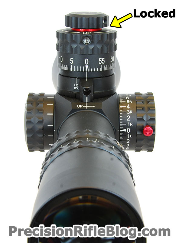 - Press & twist turret lock – With the new turret lock mechanism, you’ll be able to see red between the lock and the elevation turret when unlocked, and not that red when it’s locked. The overall idea of having to apply downward pressure and twist to lock the turret doesn’t seem convenient from behind the rifle, but it works.