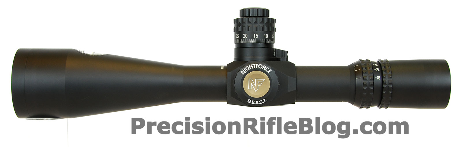 - Elevation turret is extremely tall – Tallest scope at 3.9” (measured vertically from the bottom of the objective bell to the top of the turret). That is 1/2” taller than 75% of the scopes tested, and is a result of the very unique turret design on the Nightforce BEAST. It includes a turret locking mechanism on top and a switch to fine tune the adjustment ½ a click on bottom, and both elements add to the height of the turret.