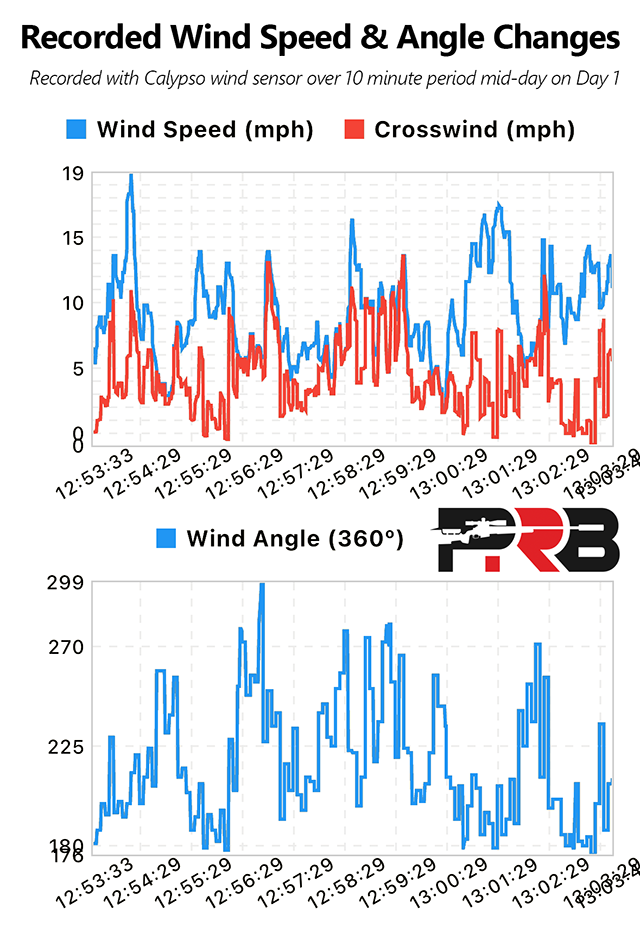 Day 1 featured very challenging, swirling winds. You can see the real data I recorded at the match in the chart, which shows gusts from 3 mph to 15+ mph, while continually changing direction by almost 100°! That snapshot is just a 10-minute window during the day. The tricky winds caused most shooters to drop 20+ points on Day 1, but somehow Austin Buschman only missed 5 shots all day!😮